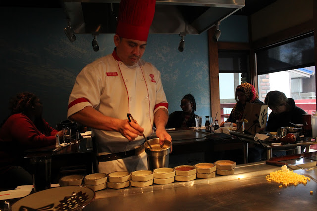 For Spring Break this year, my mom and dad surprised us with a trip to a hotel for a night away. For dinner the first night, we went to a hibachi grill, Benihana. I would highly recommend it! I had a blast taking pictures of the amazing "show" they put on for us.